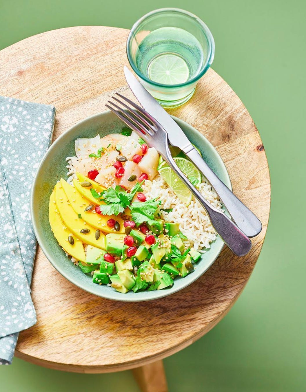 Dans quatre bols, rĂ©partis le riz comme base. Ajoute la daurade marinĂ©e, les dĂ©s de mangue, dâavocat, et les graines de grenade.